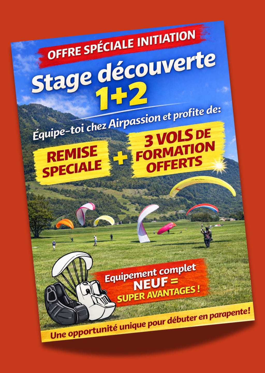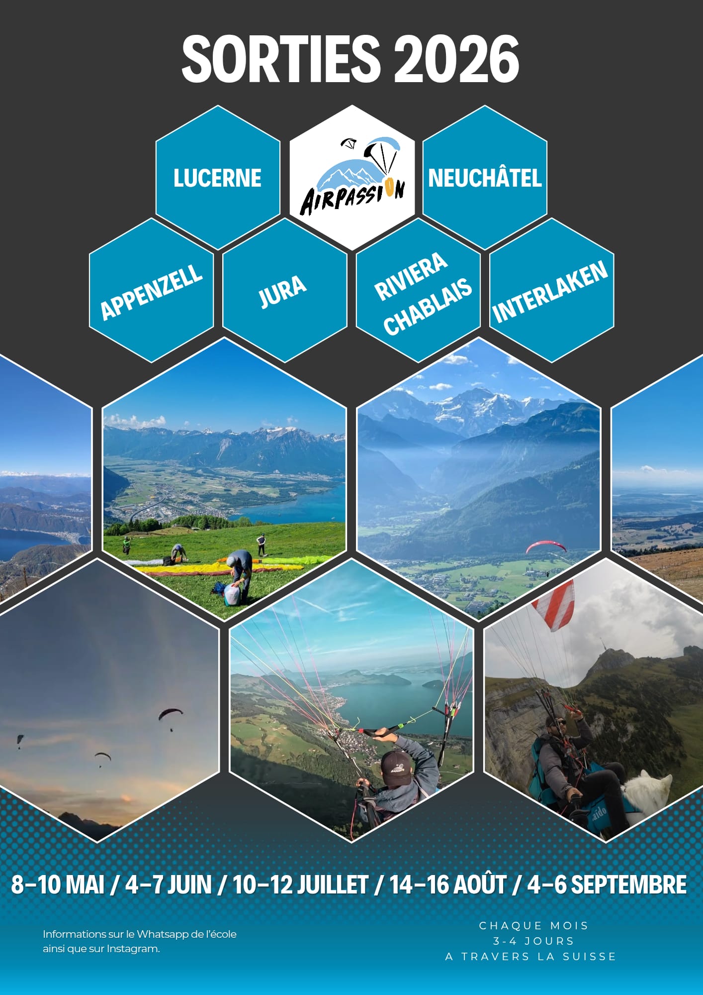 Vous faire rêver! Voilà l’objectif principal d’Airpassion. Que ce soit tout au long de votre formation ou lors d’un vol en parapente biplace, l’émotion est au rendez-vous. Et quoi de plus beau qu’un saut en parapente en Suisse…
